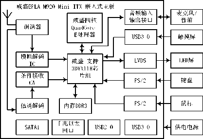 GHz威盛QuadCore-E四核E系列處理器或1.0GHz威盛EdenX2處理器及最新的威盛VX11H媒體系統(tǒng)芯片組,為微型化系統(tǒng)提供出色的計(jì)算性能。該系列屬于X86體系,可運(yùn)行WINDOWS8和ANDROID4.X嵌入式操作系統(tǒng)。從系統(tǒng)框圖中可以看出,在PC主板的基礎(chǔ)上增加了數(shù)字高清電視高頻頭和信道解碼部分電路以及模擬信號(hào)高頻頭和標(biāo)清信號(hào)的解碼電路,從而完成模擬電視與數(shù)字電視的接收功能,并通過(guò)USB3.0接口連接觸摸屏,實(shí)現(xiàn)觸摸輸入取代傳統(tǒng)的鍵盤與鼠標(biāo)輸入。通過(guò)PC主板自帶的語(yǔ)音輸入輸出口完成語(yǔ)音的輸入輸出,實(shí)現(xiàn)標(biāo)準(zhǔn)的人機(jī)交流。采用最新的威盛EPIA-M920Mini-ITX主板不僅節(jié)約了研發(fā)成本,減少了一體機(jī)的體積,還降低了功率,減少了發(fā)熱量。