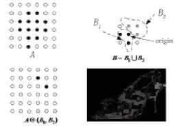 先腐蝕后膨脹稱為開(kāi)運(yùn)算,如圖4所示。上面的兩幅圖中的左邊是被處理的圖像X(二值圖像,這里主要針對(duì)的是黑點(diǎn)),右邊是結(jié)構(gòu)元素B;下面的兩幅圖中的左邊是腐蝕后的結(jié)果,右邊是在此基礎(chǔ)上膨脹的結(jié)果??梢钥吹?,原圖經(jīng)過(guò)開(kāi)運(yùn)算后,一些孤立的小點(diǎn)被去掉了。