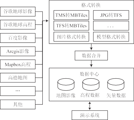 數(shù)據(jù)集成將各類(lèi)應(yīng)用系統(tǒng)資源與數(shù)據(jù)資源進(jìn)行格式轉(zhuǎn)換,并將各類(lèi)相關(guān)數(shù)據(jù)進(jìn)行合并,最終在信息服務(wù)器內(nèi)形成統(tǒng)一格式的地圖影像數(shù)據(jù)、高程數(shù)據(jù)及矢量數(shù)據(jù),最終應(yīng)用于演示系統(tǒng)。數(shù)據(jù)集成處理主要需解決數(shù)據(jù)來(lái)源問(wèn)題、格式轉(zhuǎn)換以及數(shù)據(jù)合并等問(wèn)題。數(shù)據(jù)集成流程如圖 2 所示。