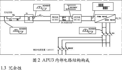 APU3由單相整流器、三相逆變器等構(gòu)成。APU3的輸入電源是牽引變壓器3次繞組輸出的AC400V,通過單相整流器變換成為直流電。該直流電通過三相逆變器變換成為交流電,提供AC400V三相50Hz電源,供應(yīng)4號車主變壓器冷卻風(fēng)機(jī),4號車、5號車的牽引|變流器CI及牽引電機(jī)冷卻風(fēng)機(jī)用電。內(nèi)部電路結(jié)構(gòu)如圖2所示。