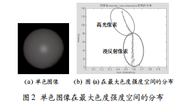 實(shí)際上,分離反射分量的方法可在一個(gè)最大色度強(qiáng)度空間中展開(kāi)。圖2所示是單色圖像在最大色度強(qiáng)度空間上的分布圖。