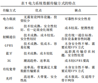 其他方式主要包括藍(lán)牙、3G、有線寬帶、光纖等。其中,藍(lán)牙在手持設(shè)備中比較普遍,其優(yōu)點(diǎn)是應(yīng)用較多,缺點(diǎn)是容易受干擾,距離和地形的影響較大,安全性不高,擴(kuò)展性不強(qiáng),可作為備選方案;3G目前還未完全普及,是無線通信的趨勢,優(yōu)點(diǎn)是速率較快,有一定的商業(yè)化規(guī)模,缺點(diǎn)是成本價(jià)格較高;有線寬帶的普及率很高,對于各電力中心之間需要傳輸?shù)拇罅繑?shù)據(jù)而言,有線寬帶才能夠滿足電力系統(tǒng)的速率和帶寬要求,是各電力中心之間數(shù)據(jù)傳輸較好的方式,而對于安全性要求,也可通過VPN的方式加以保障;光纖的速率和帶寬完全能滿足要求,由于是專用網(wǎng)絡(luò),所以安全性也很高,但缺點(diǎn)是成本也很高,只適用于國家電網(wǎng)的主干網(wǎng)絡(luò)使用。表1所列是電力系統(tǒng)數(shù)據(jù)傳輸方式的一些特點(diǎn)。