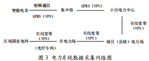 集中器是小區(qū)電力中心:基于GPRS的VPN方式;未來可選用基于3G標(biāo)準(zhǔn)的VPN方式。小區(qū)到城區(qū)(縣鎮(zhèn))選擇基于有線寬帶的VPN方式。城區(qū)到市也選擇基于有線寬帶的VPN方式。市到區(qū)域國家電網(wǎng):可選擇基于有線寬帶的VPN方式或光纖專網(wǎng)。其總體網(wǎng)絡(luò)如圖3所示。