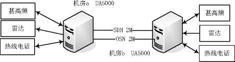 在機(jī)房a、b、c各安裝一臺UA5000設(shè)備,采用SDH、OSN雙干線,承載業(yè)務(wù)均為窄帶信息,包括甚高頻、雷達(dá)數(shù)據(jù)、熱線電話、異步電報等。圖1所示為測試平臺對設(shè)備進(jìn)行業(yè)務(wù)承載測試示意圖。