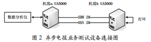 通過SRX板的異步工作方式來實現(xiàn)電報業(yè)務(wù)的傳輸。在測試過程中,使用數(shù)據(jù)分析儀仿真異步數(shù)據(jù)接入機(jī)房aUA5000節(jié)點,傳到機(jī)房bUA5000節(jié)點,通過打環(huán)將異步數(shù)據(jù)返回至機(jī)房a節(jié)點,設(shè)備連接如圖2所示。