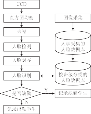 在學(xué)生入學(xué)時,都會采集他們的面部圖像,存儲在數(shù)據(jù)庫中,并按班級分類,將這些圖像經(jīng)過預(yù)處理后按班級保存在學(xué)生人臉特征數(shù)據(jù)庫中。在上課考勤時,對在教室采集到的圖像進(jìn)行人臉檢測和對齊,并和數(shù)據(jù)庫中圖像逐一進(jìn)行比較,如果能識別出來,則在考勤數(shù)據(jù)庫中標(biāo)記出勤信息。開始上課后,系統(tǒng)將自動啟動考勤流程,在一節(jié)課堂中多次采集學(xué)生圖像并進(jìn)行人臉識別,自動獲得出勤率,節(jié)省了大量時間,而且不會有任何弄虛作假情況。具體流程如圖 2 所示。