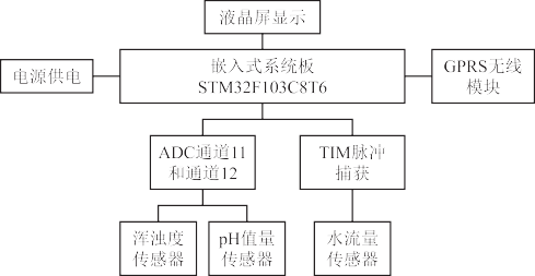 下位機的運用以 CPU 為中心,在考慮渾濁度、pH 數(shù)值以及水流量的基礎上進行工作。數(shù)據(jù)采集系統(tǒng)借助傳感器對兩個所需直流電壓進行實時檢測與記錄,并將其轉(zhuǎn)換成計算機能夠處理的電信號。此外,使用 LCD 液晶屏,用動態(tài)連接的方式進行數(shù)據(jù)的實時顯示。PC 端數(shù)據(jù)采集可以使用串口調(diào)試助手進行調(diào)試,由主機對下位機采集的數(shù)據(jù)進行正確顯示 [5] ;另一方面,STM32 MCU 將數(shù)據(jù)輸出到 USART 串行端口。GPRS 無線模塊接收數(shù)據(jù)并通過內(nèi)部通信功能將數(shù)據(jù)發(fā)送到數(shù)據(jù)中心管理平臺。對于數(shù)據(jù)的傳輸、處理和儲存問題,即在 STM32 單片機的基礎上,根據(jù) TCP 網(wǎng)絡協(xié)議, 運用 GPRS 模塊把實時采集的數(shù)據(jù)無線傳輸?shù)綌?shù)據(jù)終端平臺 [6]。工作人員可以使用基于 C# 軟件工作的操作平臺進行人機操作。該操作平臺的數(shù)據(jù)庫使用 SQL 開發(fā),軟件使用C# 語言,將傳感器采集的數(shù)據(jù)進行實時處理和儲存,便于工作人員檢查和監(jiān)測。該監(jiān)測系統(tǒng)的使用,減少了環(huán)保局工作人員前往一線勘察的次數(shù),提高了環(huán)保局的工作效率。系統(tǒng)模型結構如圖 1 所示。