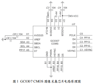 整個(gè)系統(tǒng)設(shè)計(jì)構(gòu)成了一體化光學(xué)指紋識(shí)別模塊。模塊設(shè)計(jì)采用光學(xué)暗背景成像原理,加入特有活體檢測(cè)芯片,在解決干手指效應(yīng)的同時(shí)解決殘留指紋誤識(shí)別、橡膠假指紋等問(wèn)題。圖1所示為格科微電子有限公司的光學(xué)GC0307CMOS圖像采集芯片應(yīng)用電路原理圖。該款CMOS圖像采集芯片是高精度、低功耗、微體積的高性能相機(jī)的內(nèi)置式組件,它把實(shí)現(xiàn)優(yōu)質(zhì)VGA影像的CMOS影像傳感器與高度集成的影像處理器、嵌入式電源和高質(zhì)量的透鏡組結(jié)合在一起,輸出JPEG圖像或圖像視頻流,支持8/10位數(shù)字傳輸JPEG圖像和YCbCr接口,提供了完整的影像解決方案。