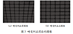 通過(guò)公式(1)和公或2)可以得到從(x,y)到(u,v)的變換,其中,A?H由光路決定,可以由具體測(cè)定數(shù)據(jù)最終確定,通過(guò)實(shí)測(cè)可以獲得原始數(shù)據(jù)。圖3所示展示了原始圖像和畸變糾正前后圖像的效果差異。