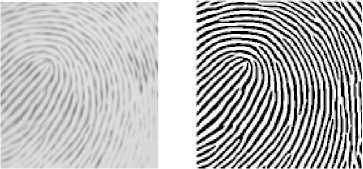 如圖5可見(jiàn),改進(jìn)的Sobel算子在原Sobel算子的基礎(chǔ)上,能顯著地分割出正確圖像的面積,幾乎能在整個(gè)畫面區(qū)域提取出正確的方向來(lái)。系統(tǒng)對(duì)圖像進(jìn)行了Gabor濾波和圖像數(shù)據(jù)二值化。指紋圖像屬于紋理圖像,紋理圖像采用Gabor濾波器[4],利用每一點(diǎn)的點(diǎn)方向沿方向指向增強(qiáng),沿方向的法線方向減弱。Gabor濾波器能很好地拼接斷紋,濾除環(huán)境噪聲,最后將Gabor濾波后的圖像做雙窗口均值門限二值化: