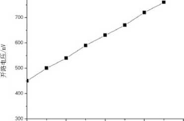 圖5所示是DSSC的開路電壓隨光照強度的變化曲線。從圖5中可以看出,隨著入射光密度的增大,開路電壓呈線性增長。在理論上開路電壓VOc由下面方程表示: