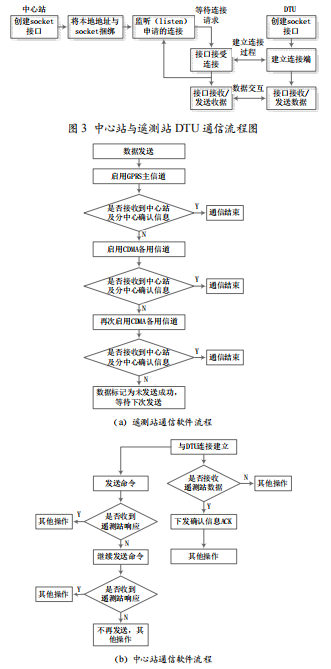 為防止中心或分中心某一通道未收到數(shù)據(jù),利用GPRS/CDMA網(wǎng)絡透明傳輸?shù)奶攸c,在中心站數(shù)據(jù)接收軟件和遙測站之間設計了數(shù)據(jù)接收確認機制[2],即遙測站及中心站的通信握手。中心站數(shù)據(jù)接收軟件在收到數(shù)據(jù)后會發(fā)送ACK(Acknowledgement)確認信息給遙測站,此確認含路由信息,遙測站通過路由信息判斷此ACK為哪個中心站發(fā)出,以判斷該中心站是否接收到數(shù)據(jù)。遙測站每次完成數(shù)據(jù)采集后啟動GPRS主信道進行數(shù)據(jù)發(fā)送,兩個目的地址的ACK如果全部收到,則此次通信流程結束。如果兩個ACK或其中某個ACK未能正常接收,則啟用CDMA備用信道進行數(shù)據(jù)發(fā)送,進行相同的ACK等待過程。如果仍未正常接收,將再次啟用CDMA信道進行數(shù)據(jù)發(fā)送。遙測站及中心站的通信軟件流程圖如圖4所示。