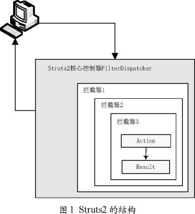 Struts2的工作流程:Web應(yīng)用啟動(dòng)時(shí),Struts框架加載并初始化Actionservlet,并從Struts.xml中讀取存放到各種配置對(duì)象中的配置信息。當(dāng)Actionservlet接收到用戶請(qǐng)求時(shí),執(zhí)行一連串的流程,最后指向的JSP組件生成動(dòng)態(tài)頁面,并且返回給用戶。Struts2的框架結(jié)構(gòu)如圖1所示。