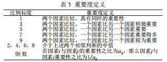 首先,將安全評(píng)價(jià)各指標(biāo)因素分為目標(biāo)層、準(zhǔn)則層和指標(biāo)層,接著采用因素的兩兩比較,構(gòu)造出各層次的所有判別矩陣,來(lái)將定性的因素定量化。構(gòu)造兩兩比較判斷矩陣時(shí),評(píng)價(jià)者需要比較兩個(gè)因素哪一個(gè)更重要,重要多少,因而需要對(duì)重要多少賦予一定的數(shù)值,采用1?9比例標(biāo)度的重要度定義如表1所列。