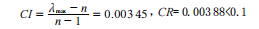 在得出判別矩陣后,可求出矩陣的特征根λ與特征向量W,再計(jì)算其最大特征根: