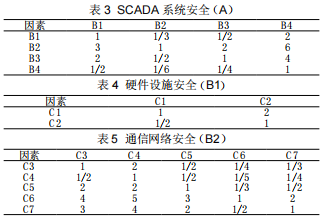 本文以某油氣田的SCADA系統(tǒng)為例,根據(jù)SCADA系統(tǒng)評(píng)價(jià)指標(biāo)體系,通過(guò)對(duì)油田現(xiàn)場(chǎng)調(diào)研與SCADA安全專(zhuān)家的咨詢(xún),對(duì)該油氣田SCADA系統(tǒng)進(jìn)行層次分析,獲得同級(jí)影響因素之間的重要度比值,見(jiàn)表3~表7所列。