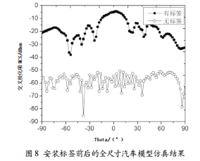 從圖中得出,安裝L型縫隙貼片陣列之后,機(jī)動(dòng)車(chē)的交 叉極化響應(yīng)得到了極大程度的提高,當(dāng)Theta等于0。時(shí),交 叉極化項(xiàng)RCS提升達(dá)54.6 dB,從而驗(yàn)證了該類(lèi)型標(biāo)簽式雷 達(dá)反射器的有效性和實(shí)用性。