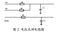 電量采集電路包括電壓采樣部分和電流采樣部分。電壓 采樣采用電阻分壓輸入(零線接參考輸出)的方法,將零線 VN與參考電壓的REFO連接,方便地實(shí)現(xiàn)了將交流采樣信 號(hào)疊加在參考電壓(2.4 V)上。電壓采樣電路圖如圖2所示。