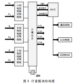 電量采集模塊帶SPI通信接口。該模塊由電壓電流信號(hào)采集模塊、計(jì)量芯片、MCU模塊、通信、模塊、LCD顯示模塊、EEPROM等組成。