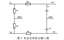 電流采樣電路采用差分輸入法,通過互感器來完成。從 電流互感器二次側(cè)取出信號(hào)接到IA1、IA2端口,輸入電阻和 電容構(gòu)成了一個(gè)抗混疊濾波器。在設(shè)計(jì)電路時(shí)一定要保證電阻 電容高度對(duì)稱性,才能保證輸入信號(hào)清晰無諧波。電流采樣 差分輸入電路圖如圖3所示。