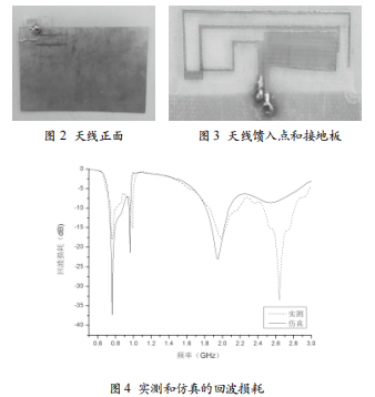 通過(guò)AnsoftHFSS軟件對(duì)天線尺寸進(jìn)行仿真和優(yōu)化,再根據(jù)優(yōu)化后得到的尺寸,對(duì)該天線進(jìn)行實(shí)物加工和測(cè)試,天線的加工實(shí)物如圖2和圖3所示。并利用矢量網(wǎng)絡(luò)分析儀對(duì)天線實(shí)物進(jìn)行測(cè)試。利用矢量網(wǎng)絡(luò)分析儀進(jìn)行實(shí)測(cè)的回波損耗如圖4所示。通常我們使用-6dB的回波損耗作為移動(dòng)終端天線性能好壞的區(qū)分點(diǎn)。通過(guò)實(shí)測(cè)的結(jié)果和仿真的對(duì)比。可以看出在我們需要的頻帶內(nèi),回波損耗都在-6dB以下。仿真和測(cè)試的結(jié)果整體基本吻合,在2.63Ghz,天線實(shí)測(cè)數(shù)據(jù)明顯好于仿真數(shù)據(jù),其主要原因是我們選用的低成本FR4板材的損耗角正切值是隨頻率增加而明顯增大的,其在高頻段其真實(shí)的損耗大于仿真過(guò)程預(yù)先設(shè)置的固定值。此外,還有一些重要的原因,比如天線尺寸的加工誤差、同軸連接器接頭的焊接精度及測(cè)量環(huán)境不穩(wěn)定等客觀因素都會(huì)造成損耗的增大。盡管如此,天線的設(shè)計(jì)還是基本達(dá)到了我們的預(yù)期。