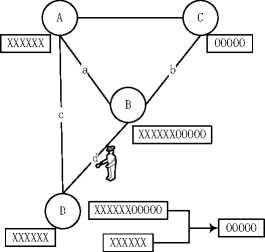 圖2中,假設(shè)節(jié)點(diǎn)A要將信息(XXXXXX)發(fā)送到節(jié)點(diǎn)D,同時(shí)節(jié)點(diǎn)C也將信息(OOOOO)發(fā)送到節(jié)點(diǎn)D,而節(jié)點(diǎn)B作為一個(gè)中繼節(jié)點(diǎn)負(fù)責(zé)信息,由于節(jié)點(diǎn)A作為節(jié)點(diǎn)D的鄰居節(jié)點(diǎn),因此節(jié)點(diǎn)D能在一跳范圍內(nèi)接收到來(lái)自節(jié)點(diǎn)A的信息,而節(jié)點(diǎn)C在節(jié)點(diǎn)D的兩跳范圍內(nèi),因此不能直接獲取節(jié)點(diǎn)C的信息,需要節(jié)點(diǎn)B進(jìn)行轉(zhuǎn)發(fā),而節(jié)點(diǎn)A也將自己的信息轉(zhuǎn)發(fā)到節(jié)點(diǎn)B,同時(shí)節(jié)點(diǎn)B也將該信息轉(zhuǎn)發(fā)。若采用傳統(tǒng)的存儲(chǔ)一轉(zhuǎn)發(fā)的模式,由于鏈路d存在不安全性,因此竊聽(tīng)人員可以節(jié)點(diǎn)B和節(jié)點(diǎn)D之間就可以竊聽(tīng)到來(lái)自節(jié)點(diǎn)A和節(jié)點(diǎn)C的信息,這樣就造成了信息的泄漏。如果在節(jié)點(diǎn)B處將來(lái)自節(jié)點(diǎn)A和節(jié)點(diǎn)C處的信息進(jìn)行處理(編碼),而節(jié)點(diǎn)D處已經(jīng)接收到來(lái)自節(jié)點(diǎn)A的信息,那么節(jié),點(diǎn)B將編碼信息(XXXXXXOOOOO)轉(zhuǎn)發(fā)到節(jié)點(diǎn)D,在節(jié)點(diǎn)D處進(jìn)行解碼,那么就可以獲取節(jié)點(diǎn)C處的信息(OOOOO)。這樣的話(huà),竊聽(tīng)者在鏈路d處只能監(jiān)聽(tīng)到編碼信息(XXXXXXOOOOO),而由于竊聽(tīng)人員處并沒(méi)有信息(XXXXXX),所以他無(wú)法獲取節(jié)點(diǎn)A和節(jié)點(diǎn)C處的任何信息,這樣就避免了信息的外泄[1'氣