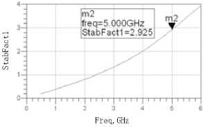 由圖2可以看出,在5GHz時,該電路的穩(wěn)定因子為2.925,大于1,可知此電壓下,其電路是穩(wěn)定的。
