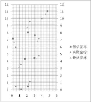 復雜環(huán)境中,測出的距離數(shù)據(jù)經(jīng)過DFP求精計算后的坐標比初始坐標也有更好的精度,最優(yōu)情況能達到0.22m,而在矩形區(qū)域的邊緣部分精度有所下降,控制在0.8m以內(nèi),如圖4所示。