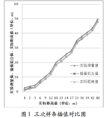 (4)把結(jié)果代入步驟2內(nèi)即可。實驗時,在范圍50m以內(nèi)選取了10個點進行實際的測量,以此10點數(shù)據(jù)進行插值求解關(guān)系表達式,然后,選取額外的15點進行插值計算,求插值后的距離值。得出實際距離、測試距離和插值距離的關(guān)系如圖1所示。