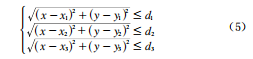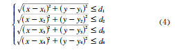 由三次樣條插值得出待測節(jié)點與各個參考節(jié)點的距離dge,(i=1,2,3,4)之后,以參考節(jié)點為圓心、待測節(jié)點到參考節(jié)點的距離為半徑作圓,初步判定待測點在4個圓所交的公共區(qū)域U內(nèi),即X。eU,并有不等式方程組式(4)成立,其中(x,y)為第i個參考節(jié)點的坐標。
