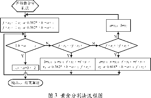 DFP法主要涉及兩個主要的算法,分別是利用黃金分割法進行一維捜索和利用DFP法計算最小點對應的自變量的值。其中,DFP算法流程如圖2所示:其中s為控制誤差,X。為輸入的初始值,E是與X。同維的單位矩陣。黃金分割法流程如圖3所示。