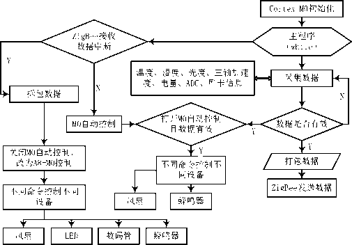 當(dāng)有ZigBee接收數(shù)據(jù)的中斷產(chǎn)生時,其他數(shù)據(jù)正常采集,ZigBee接收數(shù)據(jù)的中斷處理函數(shù)接收A8服務(wù)器發(fā)送過來的指令,執(zhí)行不同的設(shè)備。
