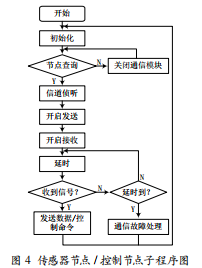 各傳感器節(jié)點(diǎn)/控制節(jié)點(diǎn)加入網(wǎng)絡(luò)后,路由節(jié)點(diǎn)進(jìn)入信道偵聽模式,而數(shù)據(jù)采集節(jié)點(diǎn)和控制節(jié)點(diǎn)進(jìn)入休眠模式。當(dāng)數(shù)據(jù)采集節(jié)點(diǎn)收到采集命令,傳感器開啟采集的工作模式,延時(shí)等待發(fā)送命令,并根據(jù)相關(guān)命令把采集到數(shù)據(jù)發(fā)送給父節(jié)點(diǎn),發(fā)送數(shù)據(jù)結(jié)束后,傳感器節(jié)點(diǎn)再次進(jìn)入休眠模式。如果延時(shí)結(jié)束仍未收到發(fā)送命令,那么說明通信出現(xiàn)了故障。而控制節(jié)點(diǎn)程序設(shè)計(jì)與傳感器節(jié)點(diǎn)類似。只是它收到父節(jié)點(diǎn)發(fā)送過來的控制命令后,去控制執(zhí)行機(jī)構(gòu)而已。其程序圖如圖4所示。