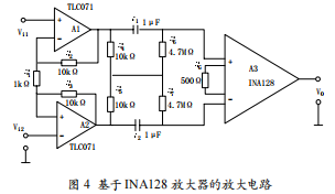 圖4的放大電路中,前級(jí)采用運(yùn)放A1和A2組成并聯(lián)型差動(dòng)放大器。阻容耦合電路放在前級(jí)放大器和后級(jí)放大器之間,這樣可以為后級(jí)放大器提高增益,進(jìn)而提高電路的共模抑制比。同時(shí),由于前置放大器的輸出阻抗很低,又采用共模抑制技術(shù),避免了阻容耦合電路中的阻、容元件參數(shù)不對(duì)稱(匹配)導(dǎo)致的共模干擾轉(zhuǎn)換成差模干擾的情況發(fā)生。后級(jí)電路采用廉價(jià)的儀器放大器,將雙端信號(hào)轉(zhuǎn)換為單端信號(hào)輸出。由于阻容耦合電路的隔直作用,后級(jí)放大器可以做到很高的增益,進(jìn)而得到很高的共模抑制比。