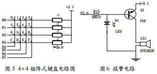由于電子秤需要設(shè)置單價(jià)(10個(gè)數(shù)字鍵),還具有確認(rèn)、刪除等功能,包括復(fù)位鍵公17個(gè)。16個(gè)按鍵采用4X4矩陣式鍵盤(pán),圖5所示是其電路圖,其中復(fù)位鍵使用獨(dú)立式按鍵實(shí)現(xiàn)。