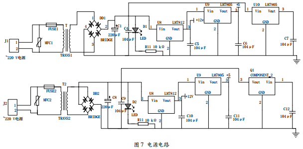 由于傳感器需要+12V的電源,而系統(tǒng)其他芯片使用+5V電源,因此,本設(shè)計(jì)采用的電源電路如圖7所示。
