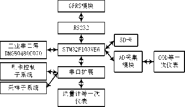 數(shù)據(jù)采集處理子系統(tǒng)的結(jié)構(gòu)圖如圖2所示。它以STM32F103VE6芯片為核心、主要由液晶+觸摸屏、數(shù)據(jù)存儲(chǔ)SD卡、A/D采集和串口擴(kuò)展等組成,通過(guò)A/D采集模塊和串口擴(kuò)展模塊實(shí)現(xiàn)對(duì)污水流量、COD、氨氮等信號(hào)采集、顯示,并在中心平臺(tái)和刷卡控制子系統(tǒng)、污水采樣子系統(tǒng)之間實(shí)現(xiàn)數(shù)據(jù)傳輸。