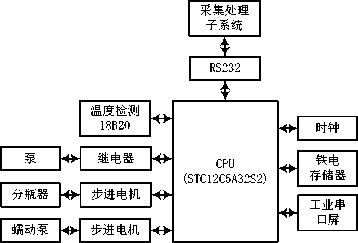 污水采樣子系統(tǒng)主要由單片機(jī)(STC12C5A32S2)、時(shí)鐘(SD2058)、工業(yè)串口屏(DMG80480C070_01WT)、溫度檢測(cè)(18B20)、泵控制、步進(jìn)電機(jī)控制、存儲(chǔ)器等部分組成。圖4所示是污水采樣子系統(tǒng)的結(jié)構(gòu)原理框圖。