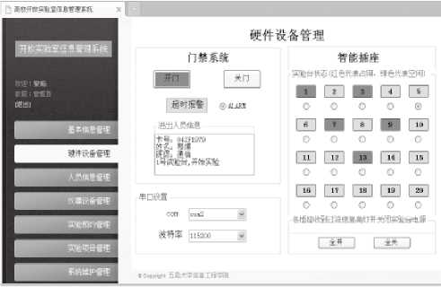 分別以實驗室領(lǐng)導(dǎo)、實驗管理人員和實驗指導(dǎo)老師的身份登錄實驗室信息管理系統(tǒng),輸入用戶名和密碼,可以進(jìn)入系統(tǒng)首頁,對權(quán)限范圍內(nèi)的模塊進(jìn)行操作。其中,硬件設(shè)備管理模塊的操作界面如圖3所示,在該模塊中,可以進(jìn)行串口設(shè)置;可以直接控制門禁系統(tǒng)開(關(guān))門,直接控制智能插座打開(關(guān)閉)實驗臺電源;可以顯示門打開超時報警信息和電源插座過流信息;可以顯示進(jìn)出人員的信息;