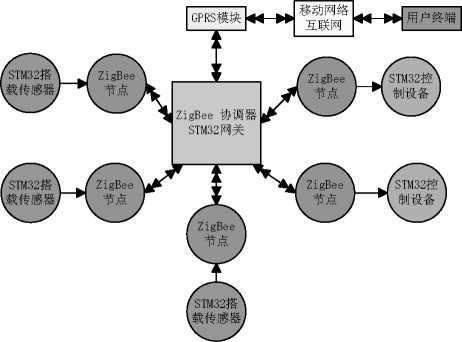 當(dāng)農(nóng)作物生長環(huán)境中的空氣溫濕度、光照強(qiáng)度等要素發(fā)生改變時(shí),溫濕度傳感器、光敏電阻等傳感器會(huì)捕捉到這一變化,并將數(shù)據(jù)傳送到STM32的微處理器,進(jìn)行數(shù)據(jù)分析處理,通過串口模式將數(shù)據(jù)發(fā)送到以CC2430為ZigBee網(wǎng)絡(luò)的終端節(jié)點(diǎn),各個(gè)終端節(jié)點(diǎn)與協(xié)調(diào)器組建無線網(wǎng)絡(luò),同時(shí)協(xié)調(diào)器通過串口把數(shù)據(jù)發(fā)送到以STM32與SIM900A構(gòu)成的網(wǎng)關(guān)。最終手機(jī)通過短信息的方式查看檢測環(huán)境信息,發(fā)送指令來操控設(shè)備。