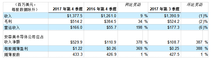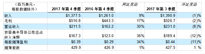 安森美半導(dǎo)體公司 (ON Semiconductor Corporation) 于美國時間2月2日宣布,2017年第4季度總收入為1,377.5百萬美元,較去年同一季度上升約9%。2017年第4季度的收入較2017年第3季度下跌約1%。