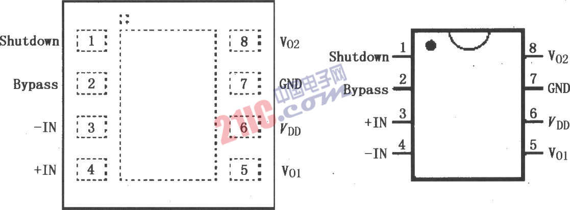LM4902是電橋音頻功率放大器,采用3.3V電源工作,能夠輸出265mW連續(xù)平均功率,帶動8Ω負(fù)載,總諧波失真及噪聲(THD+N)為1%。LM4902不需要輸出耦合電容、自舉電容和緩沖器,適用于低功率的便攜式設(shè)備。LM4902有一個外部控制的低功耗關(guān)斷模式和熱關(guān)斷保護(hù)電路,整體閉環(huán)增益響應(yīng)穩(wěn)定,其引腳排列如圖所示。