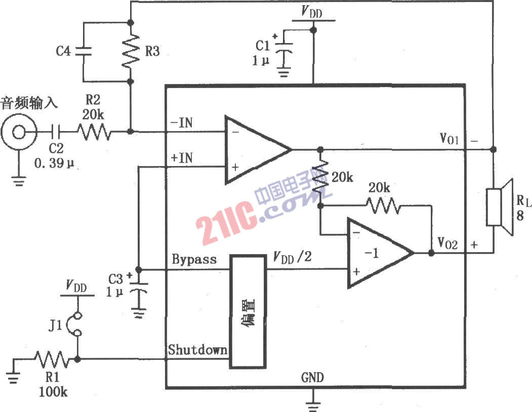 如圖所示為LM4904高增益音頻放大電路。J1為跳線,當(dāng)J1斷開(kāi)時(shí)3腳接地,放大器全功率工作;當(dāng)J1接通時(shí)3腳接VDD,放大器微功率關(guān)斷。