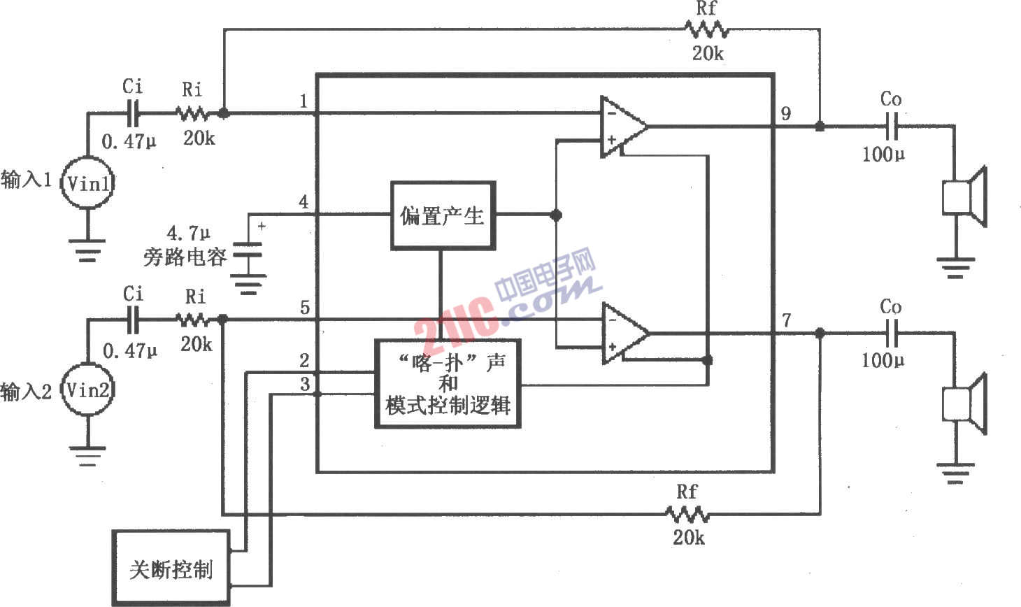 如圖所示為LM4912用于雙聲道的放大電路。左、右聲道音頻信號分別輸入LM4912的1、5腳,經(jīng)過內(nèi)部放大器放大后分別由9、7腳輸出,經(jīng)過耦合電容Co加到各自聲道的揚聲器上。放大器的最大功耗PDMAX=VDD2/2π22RL。(輸出電容耦合模式)。LM4912的2外接關(guān)斷控制,當2腳接VDD時允許工作;接低電平時禁止工作,降低芯片功耗。LM4912的3腳為靜噪控制,當3腳接VDD時禁止工作,以消除轉(zhuǎn)換引起的“喀-撲”聲;接低電平時允許工作。