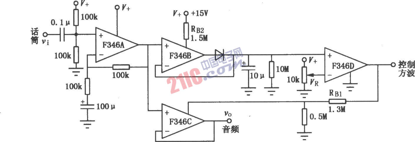 如圖所示為采用四程控集成運(yùn)放F346組成的音頻起動(dòng)開關(guān)放大電路。程控運(yùn)放就是運(yùn)放的恒流 源電路可由外部進(jìn)行控制,當(dāng)恒流源注入偏流時(shí),運(yùn)放處于工作狀態(tài),否則就處于截止?fàn)顟B(tài)。此外,當(dāng)改變偏流值時(shí),運(yùn)放的參數(shù)也將隨之改變。運(yùn)放A組成同相放大器,其輸出分兩部分,一路進(jìn)入半波整流器B,另一路進(jìn)入放大器C(放大器C接成跟隨器形式),運(yùn)放D作為電壓比較器,其參考電壓VR加至反相輸入端。