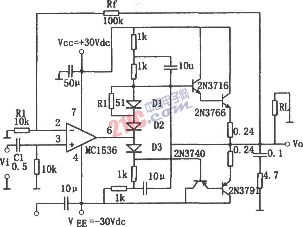 如圖所示為音頻功率放大電路。該電路采用了具有高壓內(nèi)補償?shù)?strong>集成運放MC1536。當電源電壓Vs=±36V時,其輸出電壓擺幅可達±30V,電源電壓最高可用到±40V,輸入偏流小(約為20nA以下),輸入失調(diào)電流小于3nA,開環(huán)差模增益可達5×106(典型值)。該芯片較適合用于低頻放大。