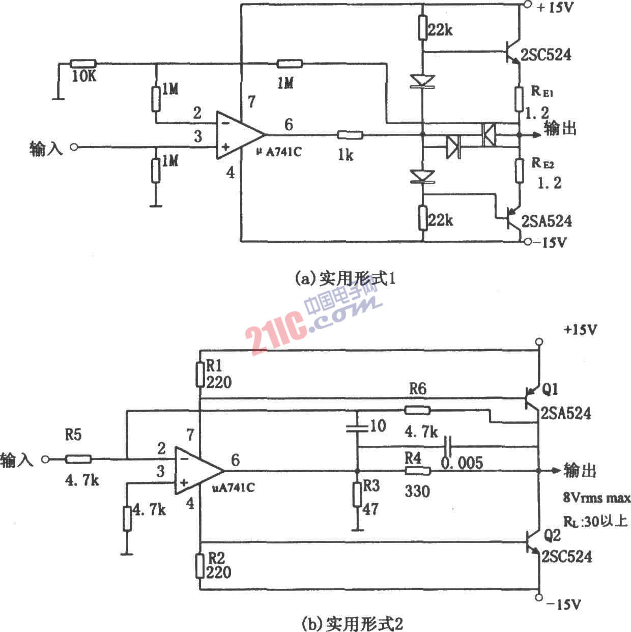 第一種實(shí)用形式如圖(a)所示,該電路的結(jié)構(gòu)是在運(yùn)放的輸出端加上互補(bǔ)對稱射極跟隨器,這種形式結(jié)構(gòu)簡單,使用方便,但電源利用率較低。由圖(a)知,電路中兩個三極管的射極分別串接了電阻RE(1.2Ω),其作用是對功放三極管實(shí)施過流保護(hù),在集成運(yùn)放的輸出端(引腳6)外接1kΩ的電阻,對μA741也起過流保護(hù)作用。圖(a)中,其電壓放大倍數(shù)約為101,4個二極管均為1S953,功放管為對管,型號為2SC524和2SA524。