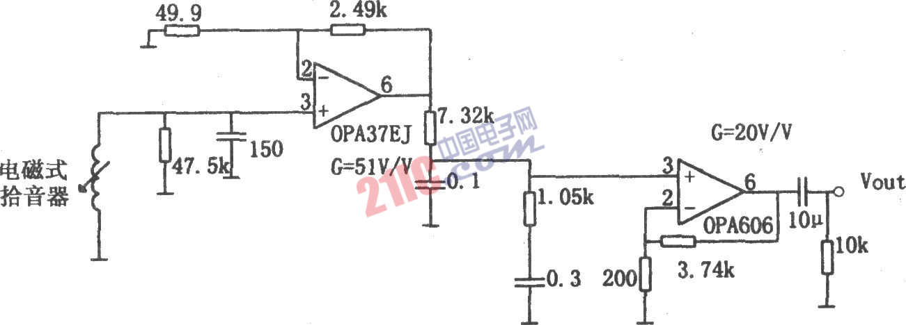 如圖所示為低噪聲高保真RIA前置放大電路。該電路使用了一片超低噪聲精密運(yùn)放OPA37E和一片介質(zhì)隔離場(chǎng)效應(yīng)管輸入型寬帶運(yùn)放OPA606。 OPA37E運(yùn)放作為低噪聲前置放大,輸入信號(hào)由電磁式拾音器取得,并送入OPA37E的同相輸入端(引腳3),與電磁式拾音器配合的負(fù)載R和C(圖中電阻為47.5kΩ,電容為150pF)的數(shù)值應(yīng)與拾音器匹配,其大小可選用拾音器廠家推薦的數(shù)據(jù)。引腳6、2之間的阻值為2.49kΩ的電阻為反饋電阻,它與阻值為49.9Ω的電阻構(gòu)成前置級(jí)電壓串聯(lián)負(fù)反饋,因而OPA37E放大電路的電壓放大倍數(shù)為Av1=(1+2.49kΩ/49.9Ω)=51倍,0PA37E的輸出電壓由引腳6送出,并經(jīng)阻容網(wǎng)絡(luò)(電阻為7.32kΩ、1.05kΩ,電容為0.1μF、0.3μF)組成雙時(shí)常數(shù)電路,用以改善頻率特性,該網(wǎng)絡(luò)對(duì)音頻信號(hào)將引入一定的衰減。