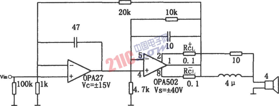 如圖所示為高保真組合音響放大電路。該電路使用了超低噪聲精密運放OPA27作為前置放大。該電路最大輸出功率可達(dá)150W。當(dāng)輸出功率為50W時,在頻率為20kHz的條件下,其總諧波失真為0.02%,在1kHz條件下,其總諧波失真為0.002%。OPA27采用同相輸入方式可提高其輸入阻抗,當(dāng)電源電壓為±15V時,其輸出線性動態(tài)范圍為±12V。OPA502也可接成同相輸入方式,其增益稍大于3,當(dāng)電源為±40V時,其輸出線性動態(tài)范圍為±35V。由下表可知,圖RCL=0.1Ω,在此限流阻值下,其限流電流值為8.1A。圖中所示電路的總電壓放大倍數(shù)為21倍。