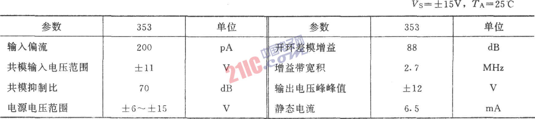 集成雙運放353的主要參數(shù)(典型值):